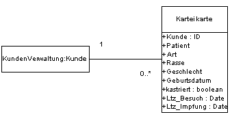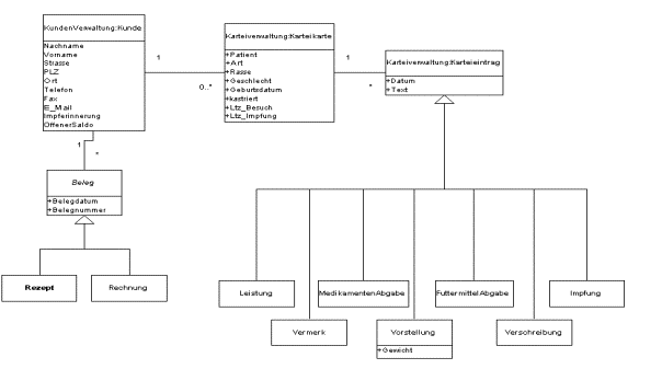 Die Kunden der Praxis sind die Patientenbesitzer. Ein Kunde kann eins oder mehrere Tiere besitzen, die als Patienten in der Praxis behandelt werden. Zu jedem Patienten existiert eine Karteikarte, die alle Einträge zu dem Patienten zusammenfasst. Ein Karteieintrag kann dabei eine erneute Vorstellung des Tieres, eine erbrachte Leistung, eine Medikamentenabgabe, eine Futtermittelabgabe, eine Impfung, ein Vermerk zu Anamnese oder Diagnose einer Erkrankung oder eine Medikamentenverschreibung sein.