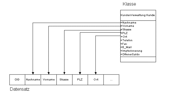 Die Projektion einer solchen Klasse auf eine Datenstruktur ist sehr einfach: Die Klasse Kunde wird auf eine Tabelle "Kunde" abgebildet, jedes persistente Attribut der Klasse (d.h. jedes Attribut, dessen Wert auch erhalten bleiben muß, wenn der Computer ausgeschaltet wird) wird zu einem Tabellenfeld.