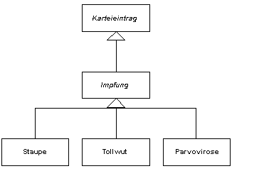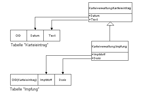 Dann wäre es wahrscheinlich angebracht, zwischen der Klasse "Karteieintrag" und "Impfung" eine vertikale Partionierung vorzunehmen und zwischen den einzelnen Unterklassen von "Impfung" eine typisierte Partionierung. daraus würden dann die beiden Tabellen "Karteieintrag" und "Impfung" entstehen, wobei im Datensatz von "Impfung" ein Feld "Typ" enthalten wäre, das den Impftyp, also die konkrete Unterklasse bestimmt.