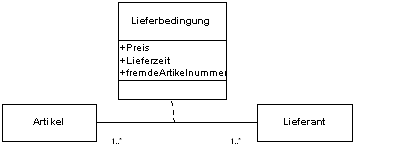 Wenn eine Assoziation eigene Attribute besitzt, werden diese im Klassenmodell in einer Assoziationsklasse untergebracht. Im Artikel/Lieferantenbeispiel können die Lieferbedingungen des Lieferanten zum jeweiligen Artikel in einer Assoziationsklasse zusammengefasst werden.